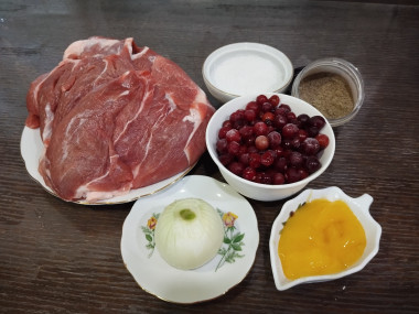Калорийность продуктов: Свиная шейка, Замороженные ягоды, Лук, Мёд, Растительное масло, Перец черный молотый, Соль