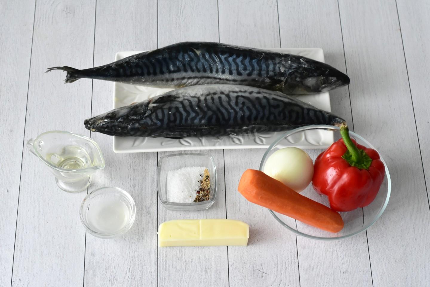 Калорийность продуктов: Скумбрия, Твёрдый сыр, Болгарский перец, Морковь, Лук репчатый, Растительное масло, Лимонный сок, Перец черный молотый, Соль