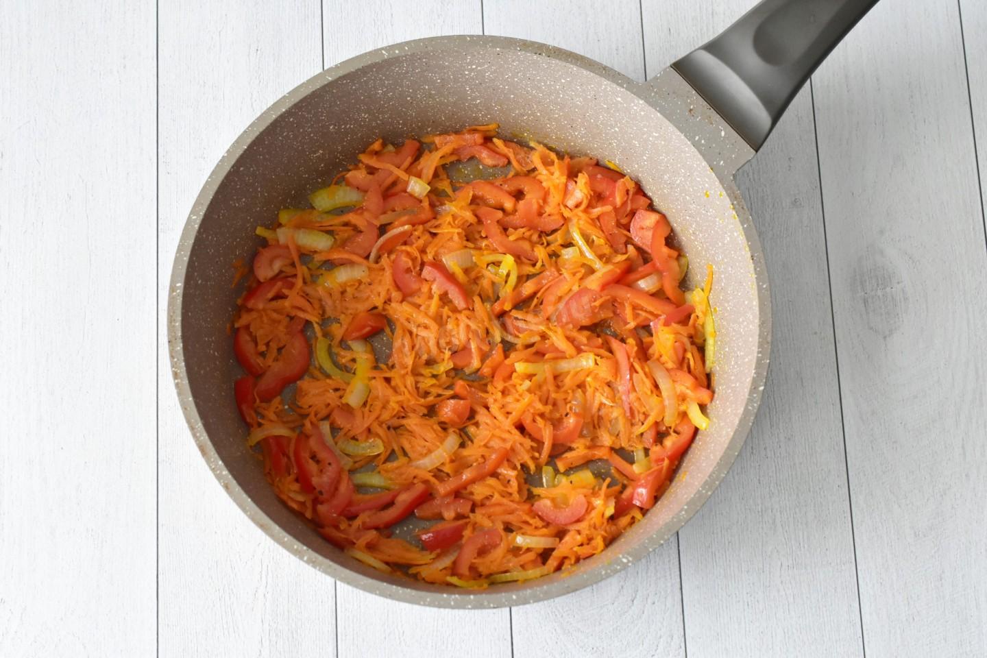 В сковороде на среднем огне разогрейте растительное масло. Выложите лук и морковь и обжарьте, помешивая, до мягкости. Добавьте болгарский перец, соль и перец и обжарьте все вместе, помешивая, 1 минуту. Как выбрать сковороду и масло для жарки, читайте в отдельных статьях. Ссылки в конце рецепта.