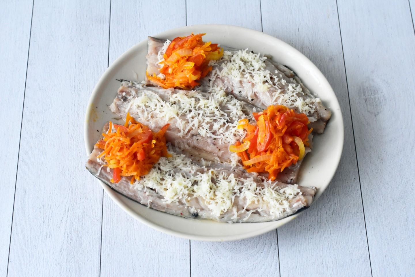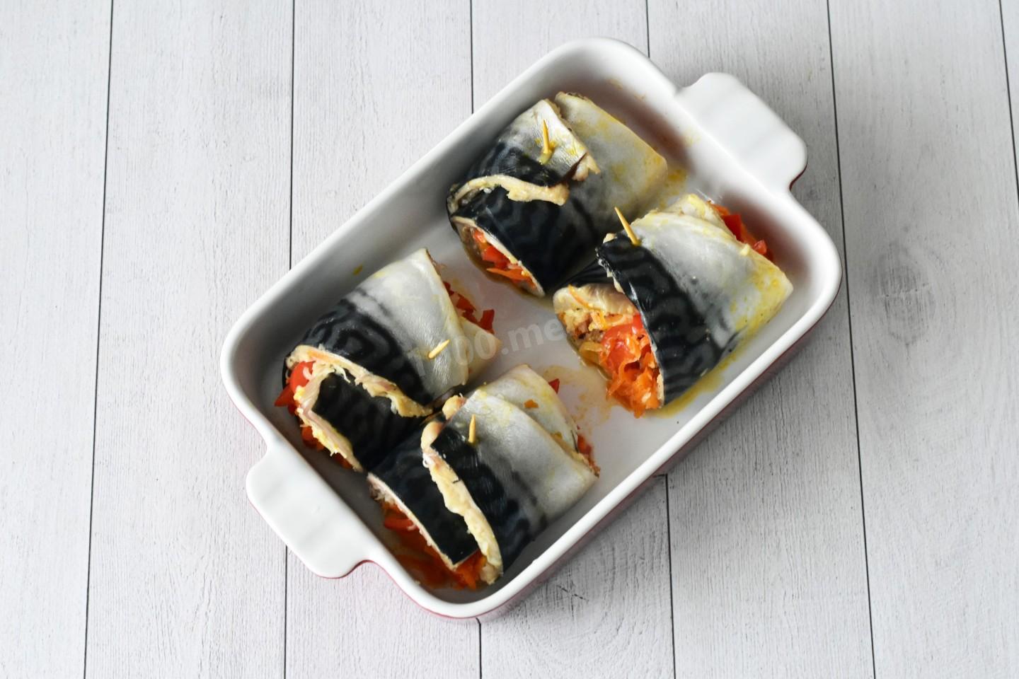 На каждое филе скумбрии с внутренней стороны по всей длине распределите тертый сыр. На широкую часть филе выложите по 1-2 ст. л. овощной начинки. Сверните филе рулетиком от широкой части к узкой и закрепите зубочисткой. Выложите рулетики из скумбрии в смазанную растительным маслом форму для запекания.