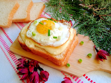 Давно хотела приготовить сэндвич Крок-мадам, но все руки не доходили) Сегодня, наконец-то, сделала себе вкусный завтрак. Сначала казалось, что готовить его долго, т.к. много составляющих. Но на самом деле получилось довольно быстро. Порция соуса небольшая, сделала его быстро. Я добавила чуть больше молока, чтобы соус получился не сильно густым, ведь он при остывании сильно густеет. Бешамель использовала пока он был теплый, так что сильно не загустел) Вместо ветчины у меня телячья колбаса, я ее слегка разогрела в микроволновке, мне так больше нравится. Яйцо у меня пожарилось компактно, не стала вырезать из него круг. В общем то и все) В общей сложности запекала 10 минут. Сэндвич мне очень понравился! Белый хлеб аппетитно хрустит, а нежнейший соус и расплавленный сыр его прекрасно дополняют. Эту нежность удачно дополняет небольшая остринка горчицы. Да еще яичница-глазунья и колбаска. Столько разных вкусов и все они отлично сочетаются между собой. Получился замечательный сытный и вкусный завтрак! Спасибо за рецепт!