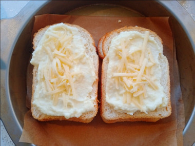 Сэндвичи тем временем уже подрумянились, достаньте их из духовки, но саму духовку не выключайте. Намажьте каждый бутерброд сверху соусом. А затем посыпьте сыром.