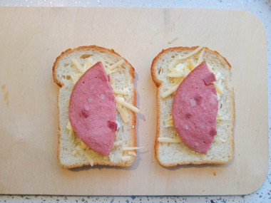 Поверх ветчины насыпьте еще немного сыра. Накройте сверху вторым куском хлеба.
