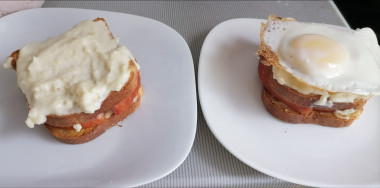 У меня не хватило немного сыра, и я передержала яйцо, но на вкус эти казусы не повлияли (๑˘︶˘๑). Получила удовольствие и от процесса приготовления, ведь делала первый раз, и от результата. Маме достался крок-месье, а мне крок-мадам! Обязательно буду пробовать готовить ещё какие-нибудь сэндвичи