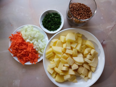 К обеду сварила суп с курицей, гречкой и картошкой. Для бульона использовала куриный супнабор . Пока готовился бульон, почистила и нарезала овощи, приготовила зажарку из моркови и лука, промыла гречневую крупу, измельчила зелень укропа и петрушки. В готовый бульон опустила картофель и гречку ( одновременно), когда они были готовы - добавила в суп зажарку, проварила всё вместе несколько минут. При подаче добавила зелень. Очень вкусный и полезный супчик получился. Спасибо автору!