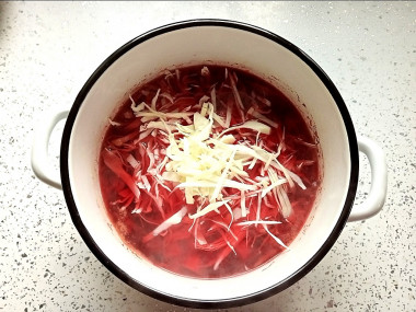 Первым делом я поставила вариться картошку, а в это время чистила и измельчала остальные овощи. Если капуста жесткая, то лучше добавить ее в кастрюлю после закипания картошки. А если мягкая и сочная, то можно и в конце. Я выложила вслед за другими овощами. Лимонным соком воспользовалась и добавила в кастрюлю вместе со свеклой. Вместо свежих помидоров добавила в суп домашнюю заготовку - перетертые помидоры.