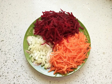 Свёклу и морковку натрите на мелкой тёрке. Сбрызнете свёклу соком свежевыжатого лимона, это придаст кислинку готовому блюду и сохранит яркий красный цвет бульону.
