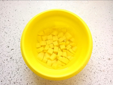 Картошку почистите и нарежьте кубиками небольшого размера. Можете измельчить клубни так, как вам более привычно, к примеру брусочками или очень крупными фрагментами.