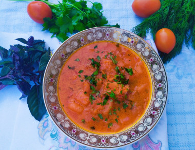Варила борщ на курином бульоне, добавила свежие помидоры и почистила их от кожуры, обдав кипятком, как советовал автор (действительно получилось очень легко, обычно я так никогда не делала).