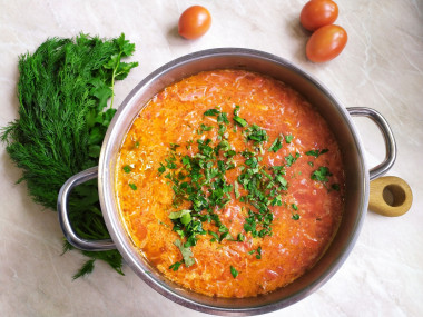 Далее добавьте в борщ помидоры, слегка убавьте плиту и готовьте ещё минут 5.