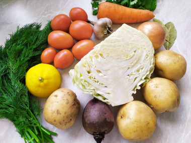 Как сварить борщ без мяса и без зажарки со свеклой? Подготовьте все необходимые овощи. По возможности используйте молодую капусту, она более мягкая и сладковатая, что придаст готовому блюду особый вкус.
