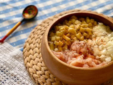 В подходящей по размеру удобной емкости соедините подготовленные куриное мясо, картофель и лук. Посолите. Можно добавить любые специи по вкусу. Все хорошо перемешайте.