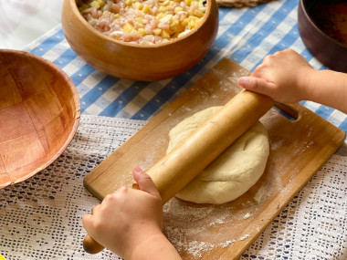 Меньшую часть теста аналогично раскатайте в нетонкий пласт. Закройте тестом пирог сверху. Края нижнего и верхнего слоев теста соедините и тщательно защипайте, чтобы пирог не раскрылся во время выпечки. Посередине пирога сделайте небольшое отверстие для выхода пара. Через него можно будет проверять начинку на готовность.