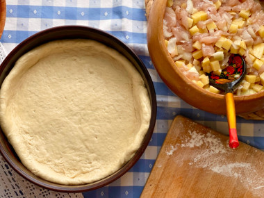 Выпекайте пирог в заранее разогретой до 180С духовке около 50 минут. После 20 минут выпекания прикройте пирог сверху фольгой. Иначе смазанный желтком он может слишком зарумяниться. Время выпечки будет зависеть от особенностей работы духовки, а также от материала формы, в которой печется пирог. Готовность начинки можно проверить шпажкой, проткнув через отверстие в пироге кусочек курицы или картошки.