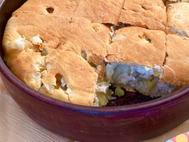 Я пользовалась керамической формой для выпечки, она нагревается дольше. Поэтому пирог выпекался 1ч 10 минут. Но преимущество керамики в том, что она хорошо сохраняет тепло, и готовое блюдо в ней долго остается горячим. Что часто очень удобно.