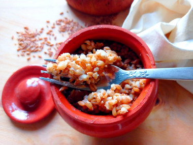 Полба, сваренная на воде. Крупу залить водой по плечики горшка, закрыть крышкой и поставить в духовку на 2-3 часа. Не забудьте посолить.