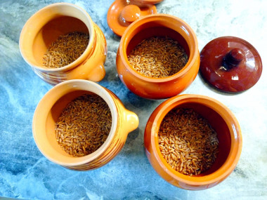Четыре горшочка (0,5 л) я заполнила полбой на 1/3. Воду залила по плечики, как и написано в рецепте. Кашу запекала при 180 градусах. Горшочки я ставила в холодную духовку, чтобы они не испортились из резкого перепада температур.