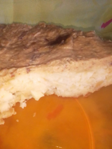 Выньте почти готовый пирог из духовки, залейте его сверху яично-масляной смесью и запекайте ещё примерно 10 минут при 180-200 градусах.