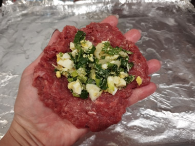 Для начинки смешала обжаренный лук, зелёный лук, петрушку и порезанные мелкими кубиками яйца. Формировала зразы на ладони, закрывая начинку внутри фарша.
