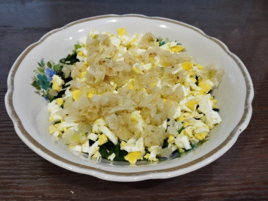 Яйца очистите от скорлупы. Нарежьте на кусочки размером не больше 1х1 см.