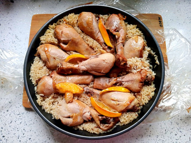 На рис уложите куриные голени. Сверху вылейте остатки маринада.