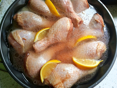 Выложите в маринад куриные ножки и хорошо перемешайте, чтобы все голени были покрыты соусом. Поставьте ножки мариноваться в холодильник минимум на 2 часа, а лучше на ночь. Периодически перемешивайте ножки, чтобы они равномерно пропитались маринадом.