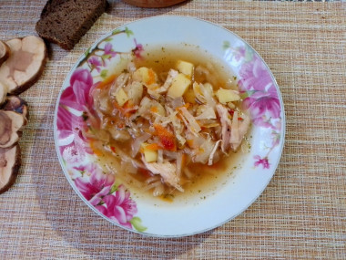 На обед приготовила свежие щи с индейкой. Для бульона взяла не индейку, а куриное филе. Очень интересно в этом рецепте, то, что овощи тушатся вместе с капустой. Я еще положила к тушёным овощам болгарский перец, потому, что он у меня сушёный. Вместо свежего помидора взяла несколько столовых ложек домашнего томата. Минут за пять до конца варки добавила сушёную зелень петрушки, а перед выключением добила пропущенный через пресс чеснок.
