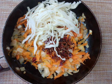 Подготовьте зажарку. В сковороде разогрейте сливочное масло и выложите на него капусту, морковь и лук. Тушите овощи, помешивая, до мягкости.