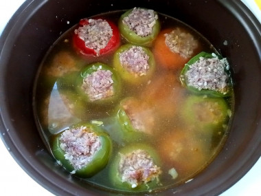 Выложите в чашу мультиварки перцы, налейте 900 мл холодной воды, добавьте соль по вкусу и лавровый лист (у меня измельченный). Активируйте режим "тушение". В моей мультиварке мощностью 700 W этот режим стоит время 1 час - этого времени как раз хватит на то, чтобы закипела подливка и перец хорошо протушился. Через 20 минут я перевернула перцы на другую сторону, так как они не полностью были покрыты подливкой. После финального сигнала блюдо готово.
