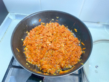 Накройте сковороду крышкой, убавьте огонь до минимума и потушите лук с морковью 5 минут.