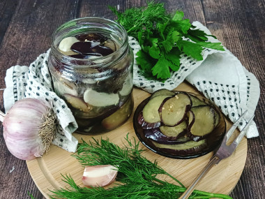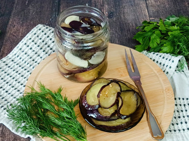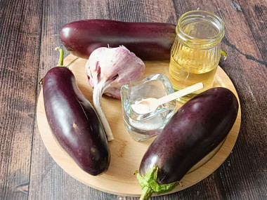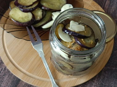 Привлекло моё внимание к этому рецепту то,что в составе минимум ингредиентов, да ещё и без стерилизации. Конечно же готовлю! Подготовила все ингридиенты и следуя описанию подготовила баклажаны. Нарезать решила их кольцами, мне так удобнее. Посолила и прикрыв баклажаны тарелкой установила банку с водой. Через определённое время слила выделившуюся жидкость и обжарила. Каждый слой баклажан прокладывала тонкими слайсами чеснока и так заполнила до верха банки.