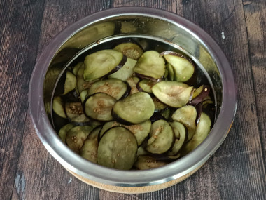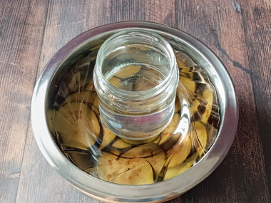 Оставьте баклажаны под грузом часов на 6, можно на ночь. Посмотрите, сколько жидкости они выделили. Благодаря этой процедуре мы удалим горечь из баклажан.