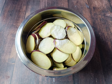 В глубокую посуду выложите нарезанные баклажаны, посолите их.