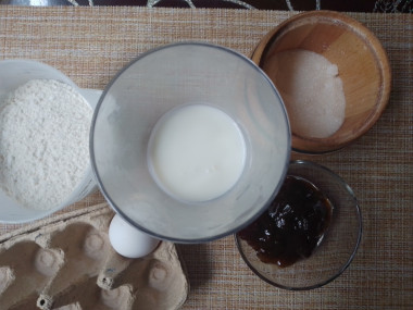 Возьмите емкость поменьше и в ней соедините кефир, куриное яйцо и растительное масло, перемешайте. Взбивать массу не нужно, просто смешивайте все до однородности.