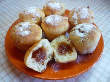 Простые и понятные, но с иным вкусом, джем их немного украсил изнутри, что пошло только на пользу!А там уже каждый решит, как поступать дальше, украшать верхушки чем либо, или кушать такими натуральными. Тесто легко и быстро готовится, можно каждый выходной печь свежие к завтраку, или на ужин!