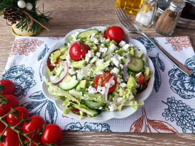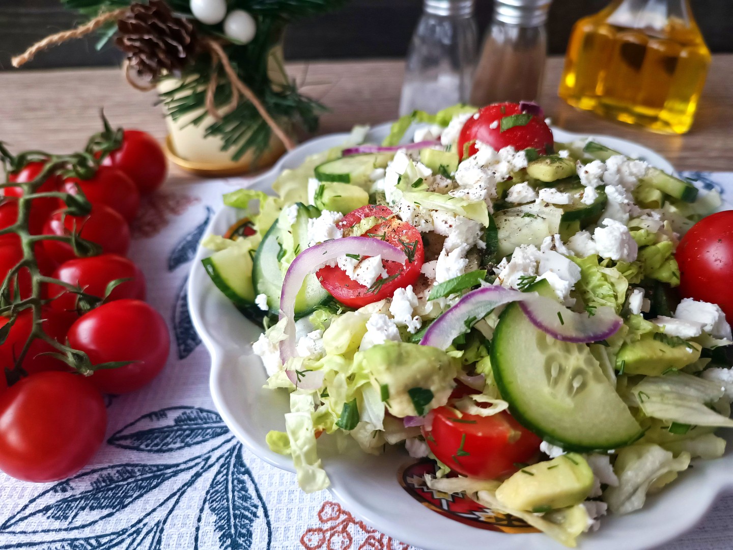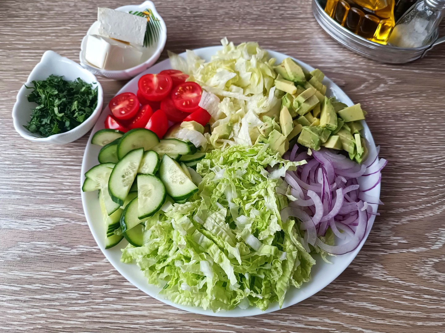 Готовила этот салат как гарнир к мясу. Получилось очень свежо и гармонично. Отличная хрустящая основа из капусты, салата айсберг и овощей, авокадо даёт приятную нежность, а сыр— приятную солоноватость. Простая заправка из масла не перебивает, а объединяет все вкусы.