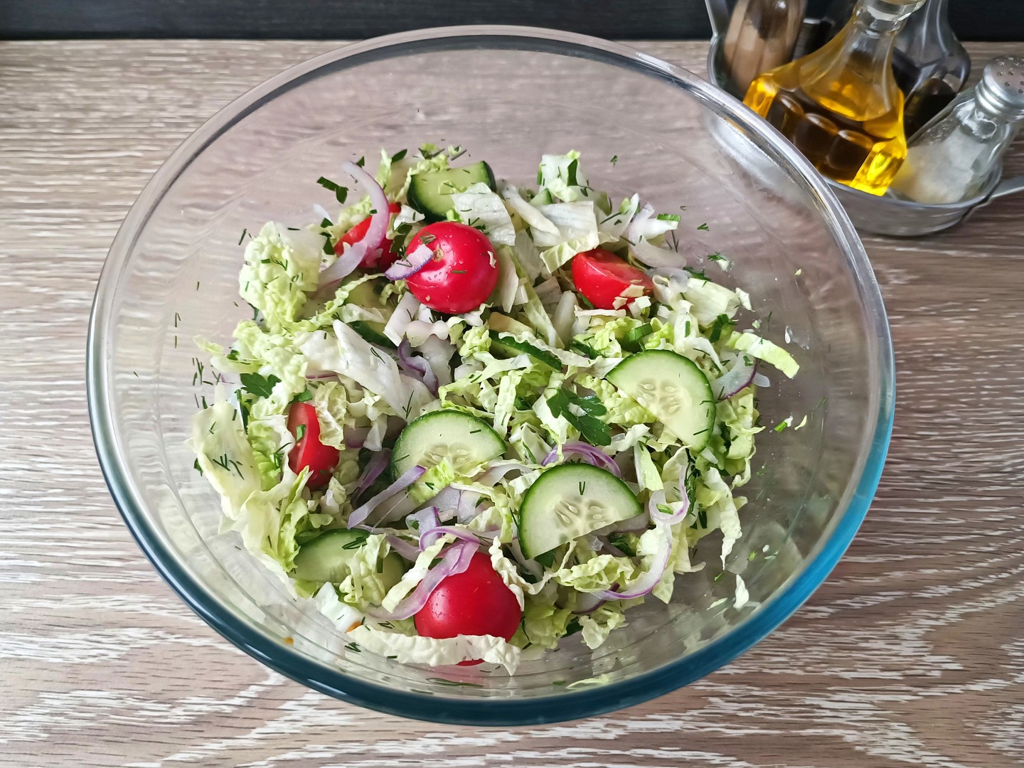 Пекинскую капусту нарежьте полосочками, сделайте полоски потоньше, так будет значительно вкуснее.