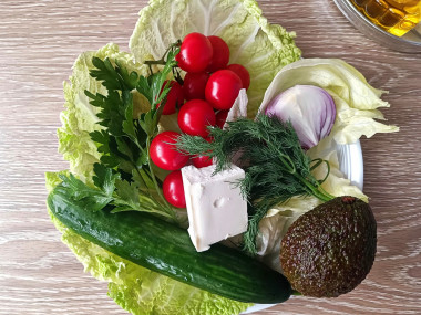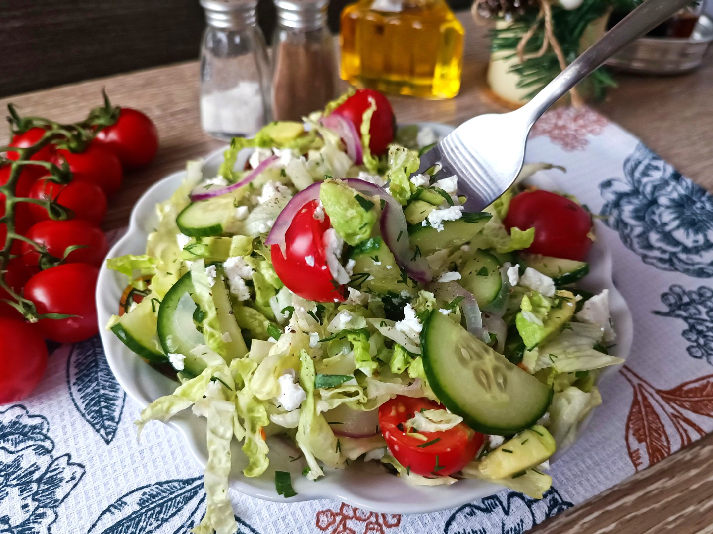 Салат с авокадо пекинской капустой огурцом и сыром отлично подошёл к мясу — не утяжелил ужин, а наоборот, освежил его. Лёгкий и низкокалорийный, можно съесть большую порцию без вреда для фигуры.