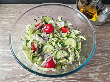 Вместо растительного масла можно взять оливковое или рапсовое, они так же хорошо сочетаются со свежими овощами.