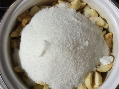 Плотным слоем выложите нарезанные кубиками яблоки в эмалированный таз или кастрюлю из нержавеющей стали. Равномерно засыпьте их всем количеством сахара, указанным в рецепте. Не перемешивайте — это важно для правильного выделения сока. Накройте таз чистой хлопковой салфеткой или марлей и оставьте при комнатной температуре на 8-12 часов (на ночь). За это время яблоки пустят сок, а сахар растворится. Перемешайте массу только перед началом варки.