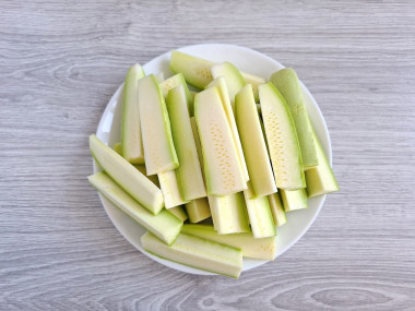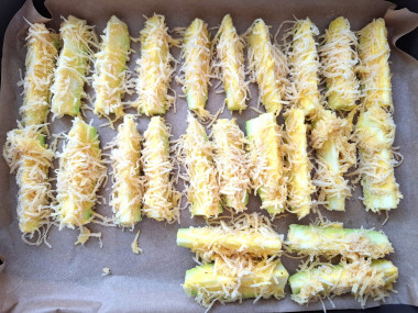 Сразу включите разогреваться духовку на 180°С. Кабачки помойте и обсушите. Отрежьте у них кончики. Разрежьте сначала кабачок вдоль пополам, затем каждую половинку на 2 или 4 части, в зависимости от желаемой толщины. Получившиеся длинные палочки разрежьте пополам уже поперек.