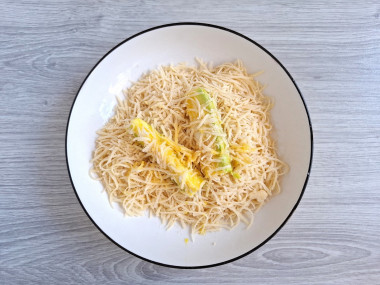 Приготовьте панировочную смесь. Смешайте для этого в глубокой тарелке панировочные сухари и натертый на мелкой терке сыр.