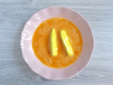 У меня молодые кабачки, поэтому шкурку не чистила, мне она нравится. Нарезала кабачки на брусочки. Решила не солить, чтобы не выделялась влага. Соль и перец добавила в яичный кляр.