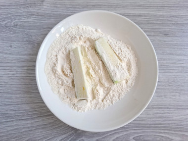 Противень застелите бумагой для выпечки. В отдельную тарелку насыпьте муку. Возьмите одну палочку кабачка, обваляйте ее со всех сторон в муке. Затем обмакните палочку в яйце. Последним идет сырная панировка. С выбором пергаментной бумаги поможет статья по ссылке в конце рецепта.
