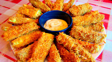 Запекала 30 минут при 180°С. Панировка хорошо подрумянилась, стала золотистой и очень аппетитной! Внутри нежная мякоть кабачков. Это просто великолепная закуска, особенно с разными соусами!