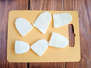 Сыр нарежьте пластинками или кубиками. Если у вас рассольный сыр, выньте его из рассола и обсушите бумажными салфетками. Затем дайте сыру полежать 5-7 минут, чтобы из пор вышли остатки влаги. Это необходимо сделать, иначе влага не даст сыру жарится - он будет тушиться. Я взяла адыгейский сыр собственного приготовления. Он отлично подходит для этих целей. Рецепт приготовления домашнего адыгейского сыра вы найдете под шагами.