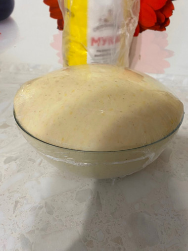 Маслом смажьте тесто сверху, чтобы не образовалась корочка при расстойке. Накройте миску салфеткой и поставьте в теплое место на 60-70 минут. За это время оно увеличится примерно в три раза.