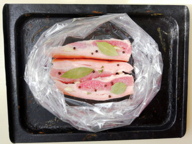 Взяла для этого пакет для запекания, еда в нем получается такой же вкусной, как и в рукаве. Кусок сала разрезала вдоль на три части. Каждый кусок нашпиговала чесноком, натёрла солью и оставила мариноваться на 10 минут. Затем поместила сало в пакет, добавила перец горошком, лавровый лист, завязала пакет и отправила его в духовку на 40 минут.