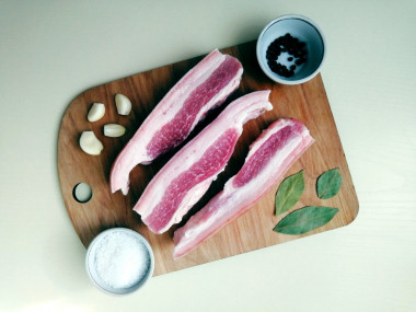 Как сделать сало запеченное в духовке в рукаве? Подготовьте все необходимые ингредиенты. Сало подойдёт любое свежее. Главное, чтобы оно было качественным - цвет должен быть однородный белый или светлый розовый, запах - нейтральный, шкурка - мягкая и без щетины. Специи выбирайте те, которые подходят для мяса, например красный, черный, душистый перец или гвоздика, майоран, тимьян, тмин.