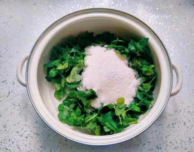 Всыпьте в кастрюлю с листьями мяты сахарный песок. Сахар можете взять не только простой белый, но и тростниковый или коричневый. Последние два дадут сиропу желтоватый цвет и тонкую карамельную нотку. Но все зависит от вашего вкуса.